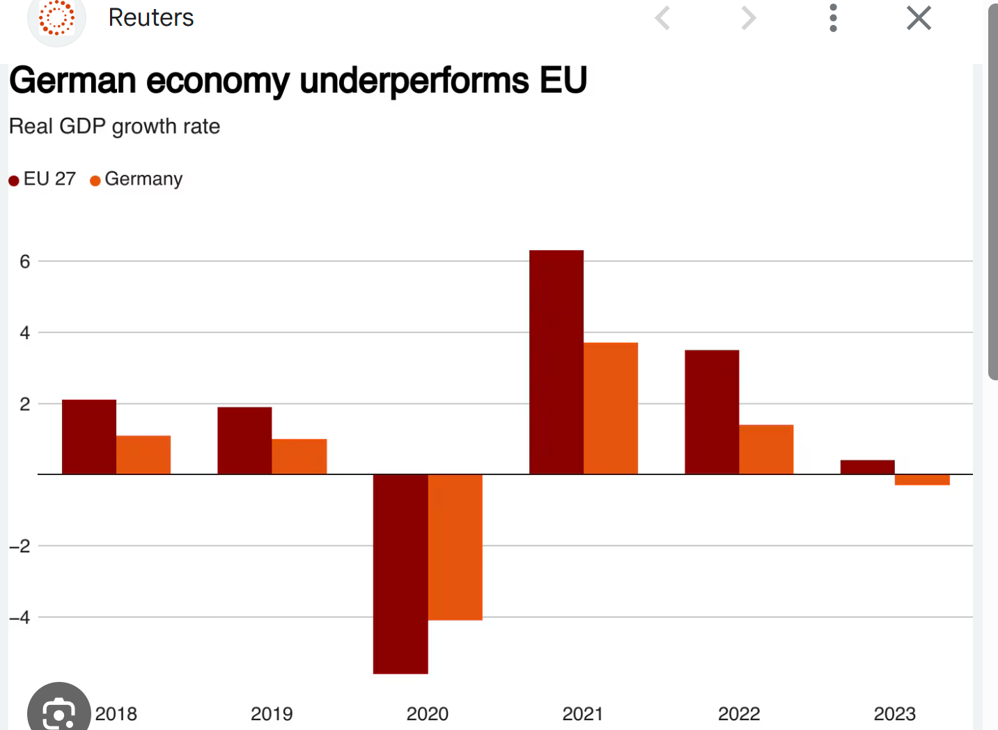 Германската економија се соочува со тешка криза со значителен пад и потенцијал за понатамошен пад, што ѝ ја донесе титулата „болниот човек на Европа“. Оваа криза се карактеризира со намалување на БДП, особено во производствената база, високи трошоци за енергија и борба за одржување на меѓународната конкурентност. Ситуацијата е дополнително комплицирана од политичката нестабилност и несогласувањата за тоа како да се справиме со економските предизвици.