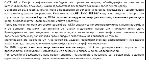 „Покрај другите проекти во енергетиката, ОКТА активно реализира иницијативи во областа на зелената енергија. Нашето стекнато искуство сакаме да го ставиме во функција на заедницата и заедно со нашите партнери да спроведеме активности кои ќе имаат значајно влијание и ќе поттикнат нови проекти во оваа област. ОКТА останува посветена на овој процес и во иднина ќе продолжиме да ја унапредуваме соработката со партнерите и заедницата. Искрено верувам дека оваа донација ќе донесе нова вредност за Центарот за обука и ќе овозможи негов развој“ потенцира извршниот директор на ОКТА Димитриос Пасхос.