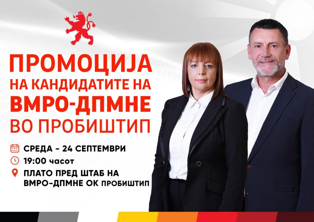 Во среда, на 24 септември, со почеток во 19:00 часот, на платото пред Штабот на Општинскиот комитет на ВМРО-ДПМНЕ во Пробиштип ќе се одржи свечена промоција на кандидатот за градоначалник и советничката листа на партијата и нејзината коалиција, соопштија од ОК ВМРО-ДПМНЕ Пробиштип.