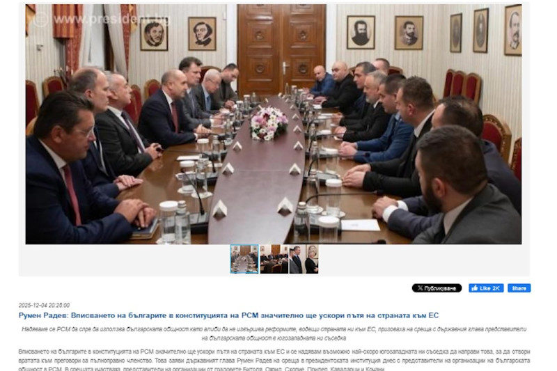 Кабинет на претседател на Република Бугарија -Тие информираа за своите загрижености во врска со тековниот процес во Скопје за развој и усвојување на Акциски план за заштита на правата на заедниците, што е важна обврска на Северна Македонија од европскиот компромис усвоен во 2022 година. Тие особено го насочија вниманието кон фактот дека не биле вклучени во подготовката на овој план од самиот почеток, како и кон исклучително краткиот рок во кој одеднаш биле повикани да дадат проценки и предлози според овој План.
